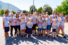 Children from the Mtendere Orphanage pose for a picture with their bags of Vitameal given to them from the Nourish The Children Initiative.
